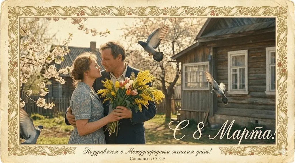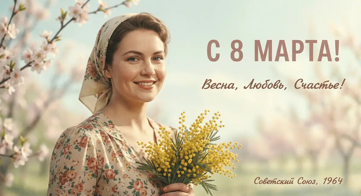 Открытка на 8 марта с использованием загруженного фото, сохранить естественные черты лица, стиль советского кино 1960-х, светлый фон, мягкое освещение, лёгкое плёночное зерно, радостная весенняя атмосфера