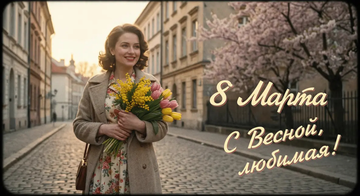 Открытка на 8 марта с загруженным фото, сохранить лицо без изменений, кинематографичный стиль конца 1950-х, мягкое освещение, нежная цветовая палитра, лёгкий плёночный эффект, романтичная атмосфера весны