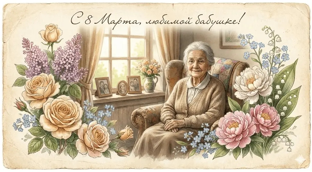 Открытка на 8 марта для бабушки с использованием загруженного фото, сохранить оригинальные черты лица, винтажный стиль, нежные цветы, тёплые оттенки, ощущение семейного уюта, аккуратная композиция, без искажений