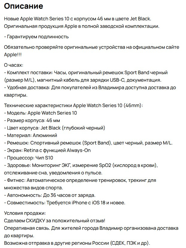 Далее актуализировал описание. Здесь мне помог DeepSeek и Gemini. Добавляю памятку об обязательной проверке оригинальности устройств перед покупкой, способы доставки и возможность скидки за положительный отзыв. Слегка понижаю стоимость на 10-ю модель до 30 500 р. на 11-е ставлю ценник 32 800р.
