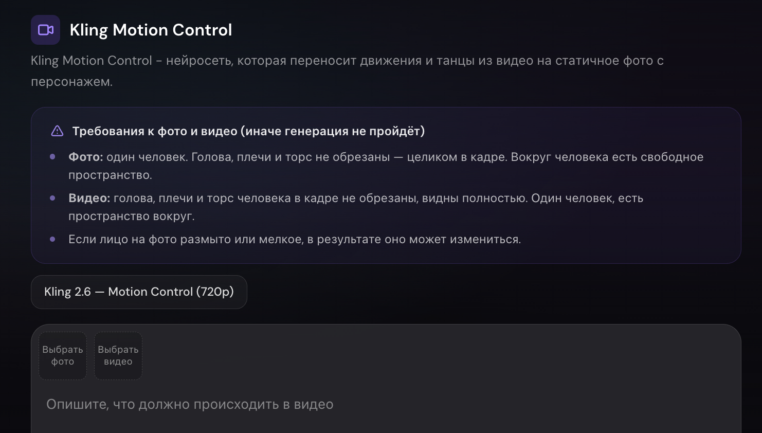 Многие инструкции в интернете предлагают использовать зарубежные нейросети для видео (например, Kling AI, Kling Motion Control) . Однако при работе с ними пользователи сталкиваются с массой проблем: жесткие лимиты на генерацию, необходимость вручную писать сложный промпт (prompt), искать качественный видео-референс и, что самое неприятное, использовать зарубежную банковскую карту для пополнения баланса.