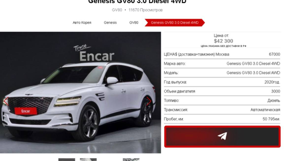 В итоге остановились на Genesis GV80. Машина не новая, но в хорошем состоянии, с понятной историей. Цена в Корее вышла 42 500 $ — без доставки в РФ. Сразу обсудили: это стоимость авто, дальше считаем все честно и по шагам.