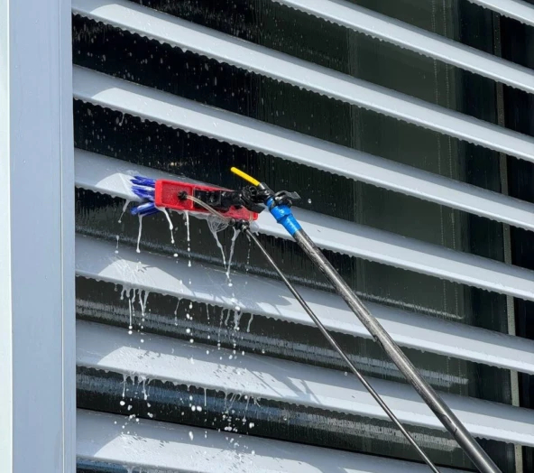 В New Cleaning мы используем телескопические штанги со щетками, в которые подается вода, и аппараты обратного осмоса — такой вариант подходит для большинства задач по очистке фасадов. С помощью штанги клинер спокойно может достать с земли до четвертого этажа. Мы применяем одновременно две штанги: с таким комплектом бригада из шести человек способна, к примеру, вымыть двух- трехэтажный торговый центр на несколько дней.
