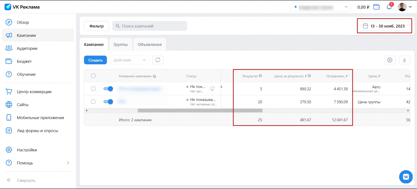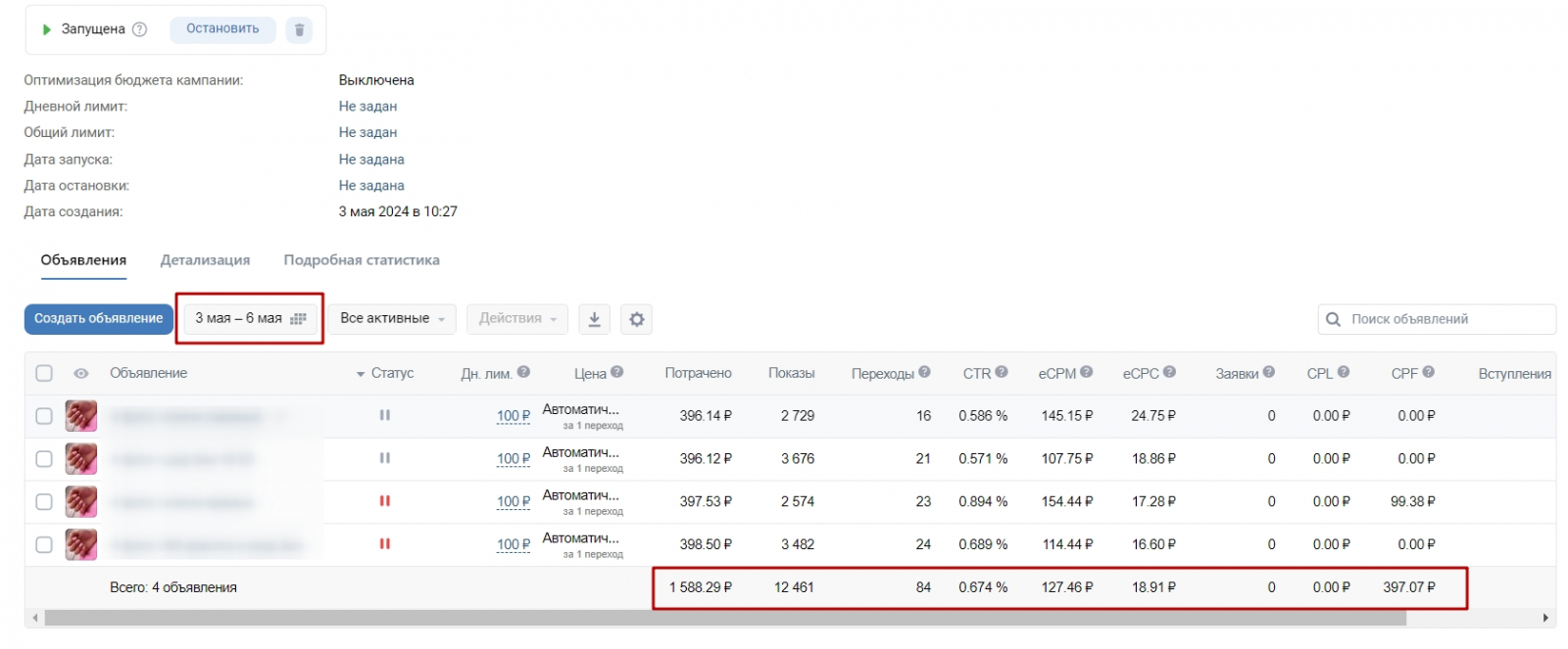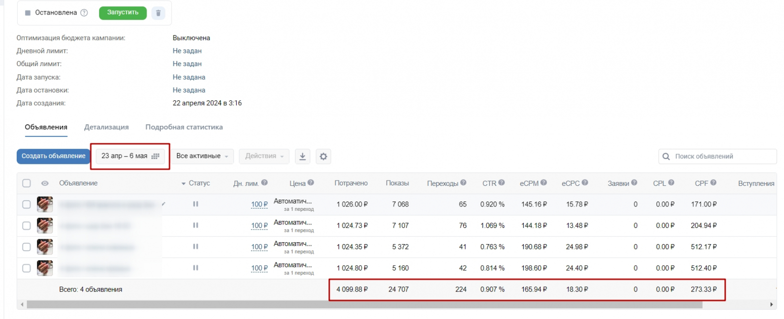 Мы запускали рекламу дважды: 2 недели тестово в ноябре 2023 года в новом кабинете ВК и совсем недавно возобновили сотрудничество, но работать начали в старом кабинете ВК (спойлер, в старом кабинете результаты лучше).