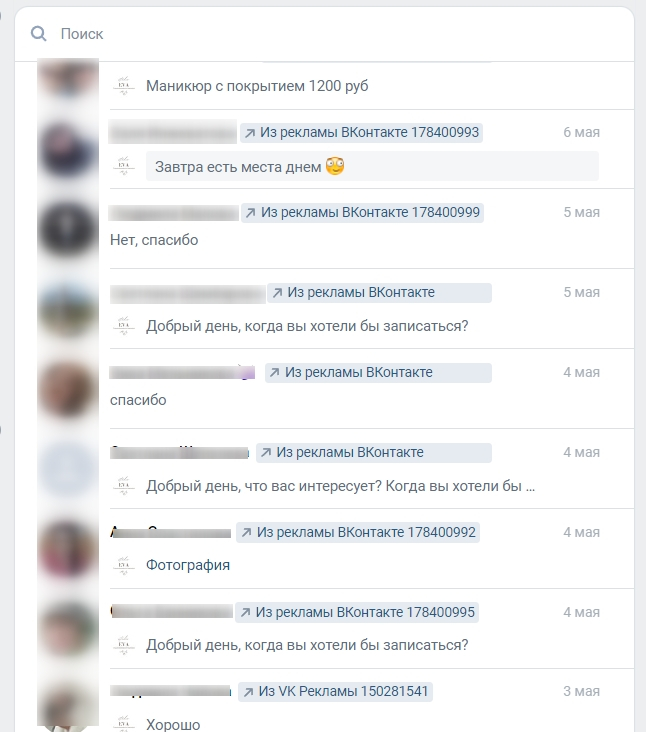 Рекламу ввели в сообщения сообщества. За две недели было получено 30 заявок по средней стоимости 189р, что является отличным результатом!🔥 В сообщениях откликались настоящие люди (мы проверяли профили), некоторые записывались, другие уточняли цены, а третьи делали пометки на будущее. Конечно, были и те, кто не отвечал на сообщения, но мы еще будем стараться их оживить через рассылку специальных предложений.