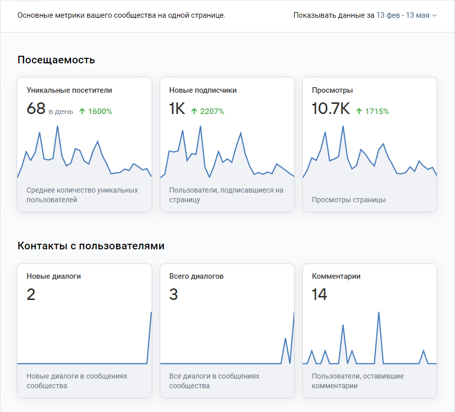 Важно перед просмотром скринов оговориться, что рекламный кабинет подтягивает в статистику только те подписки и сообщения, которые совершены в первые 10-15 минут после перехода по рекламе. То есть если человек написал или подписался позже, то на скрин он не попадет, но фактически перешел с рекламы. Поэтому мы считаем всех новых подписчиков сообщества за период, зная, что других настолько активных источников трафика у них нет (только рекомендации и карты, что не сильно влияет на показатель подписок)