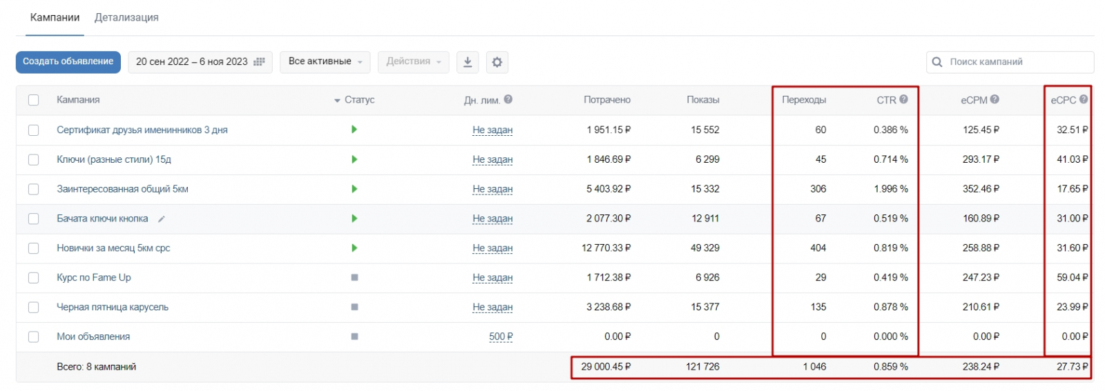 Всего работали в 2 кабинетах. На первом скриншоте отдельный рекламный кабинет, в котором некоторое время крутили отдельно рекламу на филиал на Садовой, чуть позже добавили рекламу этого филиала в основной кабинет