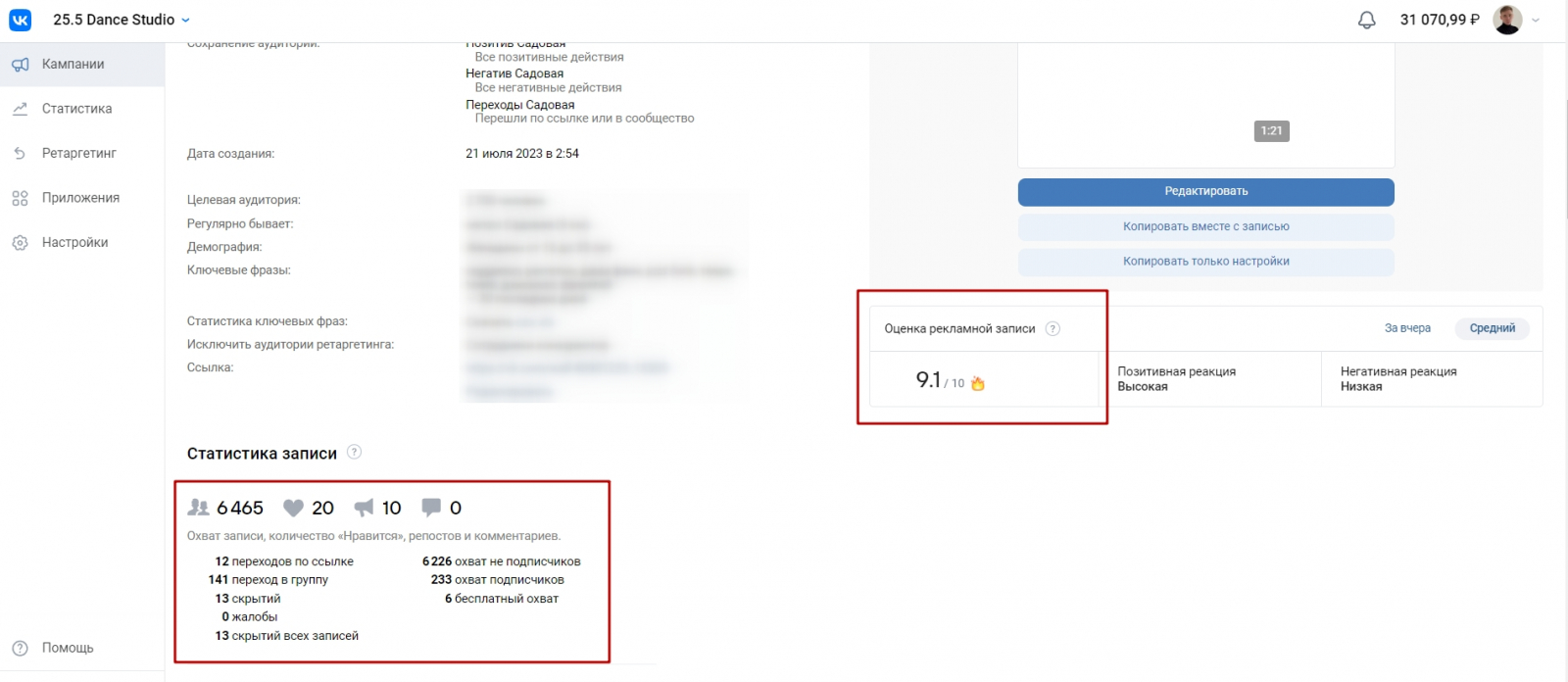 Большая часть рекламных объявлений имеет оценку от ВК выше 8 баллов (это второстепенная оценка, опираться сильно на нее не стоит, но все-таки о чем-то это говорит🙃)