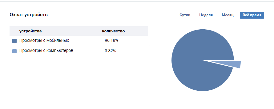 Интересно посмотреть на статистику по устройствам. Известно, что интерфейс приложения ВК и работа некоторых мини-приложений отличается в зависимости от типа устройства. Статистика говорит о том, что контент и рекламу мы должны максимально адаптировать под мобильные устройства 👇🏻