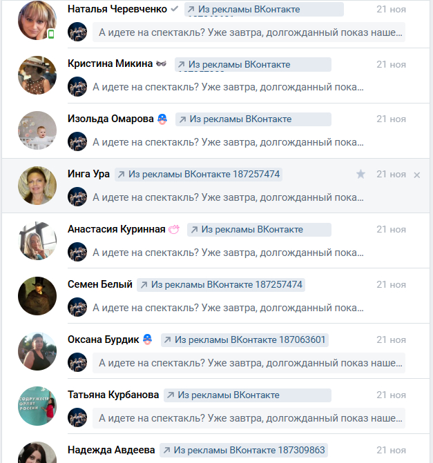 Скриншот сообщений в сообществе ВК👇На скриншоте видно метки, указывающие на то, что человек пришел с рекламы, а также одинаковое сообщение от нас - рассылка перед спектаклем.