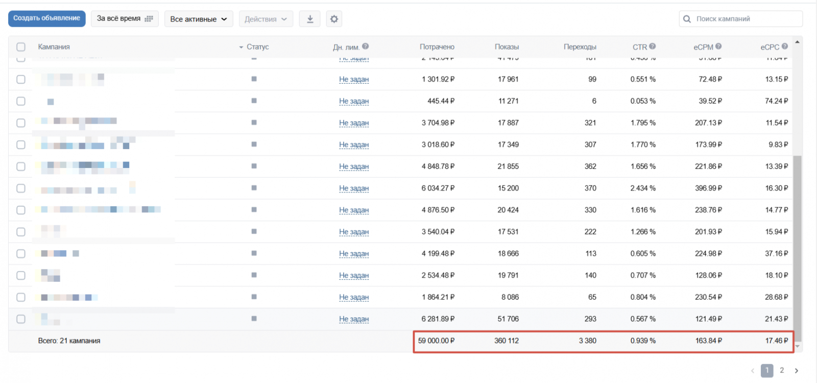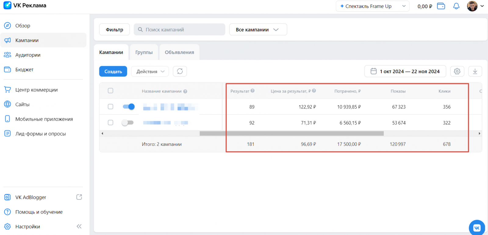 Показатели рекламы в старом кабинете: