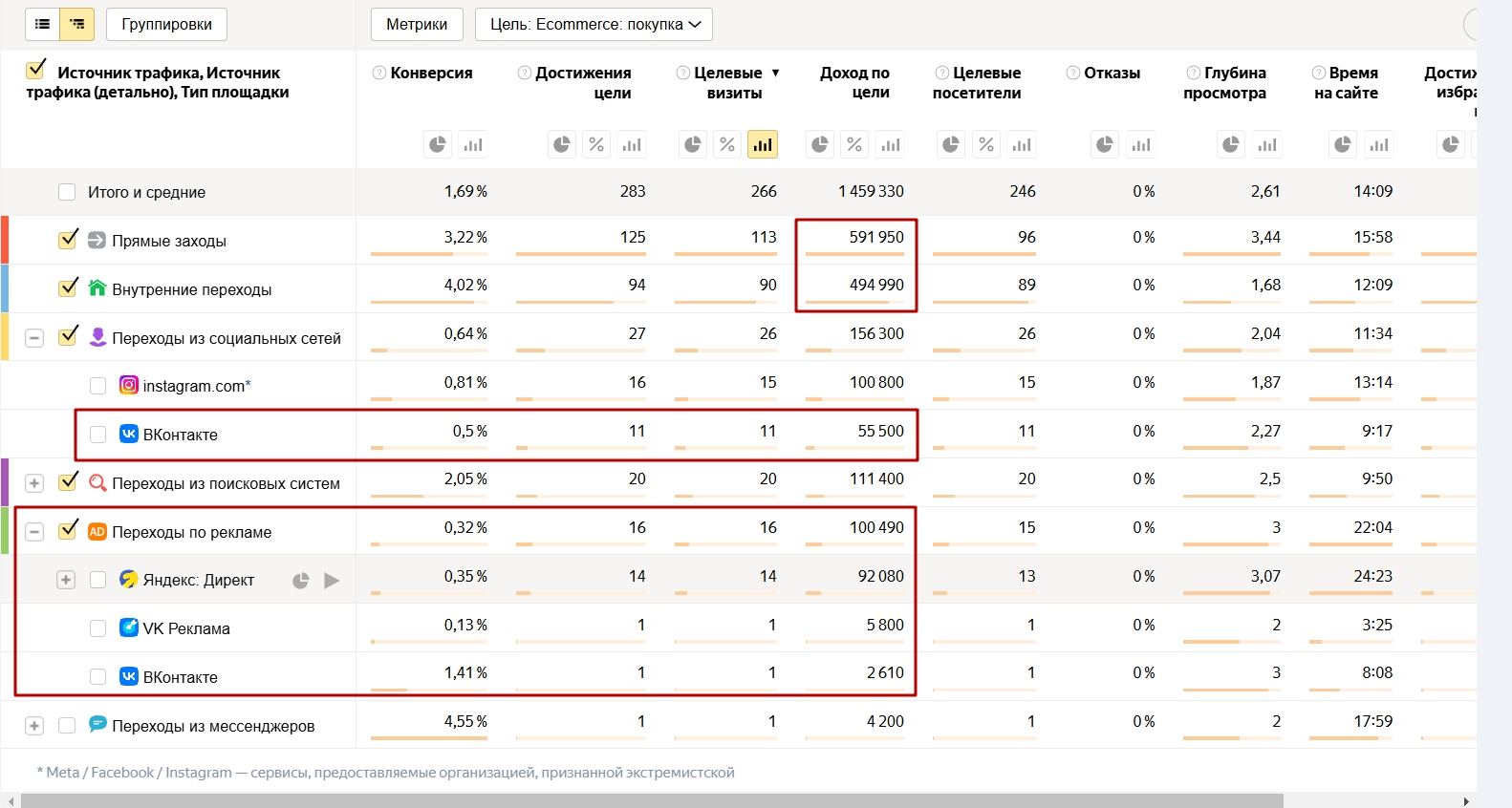 К сожалению, мы не можем точно определить, сколько именно продаж из наших источников попало во внутренние переходы. Игнорировать данные о внутренних переходах также невозможно, поскольку они составляют около полумиллиона рублей в билетах, полученных именно из этого источника. В связи с этим мы решили пропорционально распределить внутренние переходы между всеми источниками. У нас есть продажи из прямых заходов, Instagram, ВКонтакте, поисковой выдачи и Яндекс.Директа. Мы вычислили пропорции, в соответствии с которыми люди покупают из этих источников. Продажи, осуществленные через внутренние переходы, были распределены по этим пропорциям между различными источниками. Поэтому в итогах нашей работы я указываю сумму продаж билетов, включая добавленную долю из внутренних переходов, рассчитанную по установленным пропорциям.