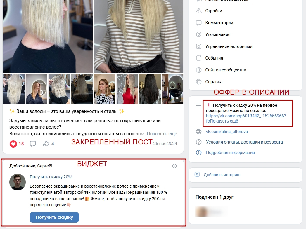 В рамках конкурса мы предлагали не только бесплатное окрашивание победителю, но и скидку на первое посещение студии всем участникам, что повысило заинтересованность в конкурсе и снизило стоимость привлечения подписчика.