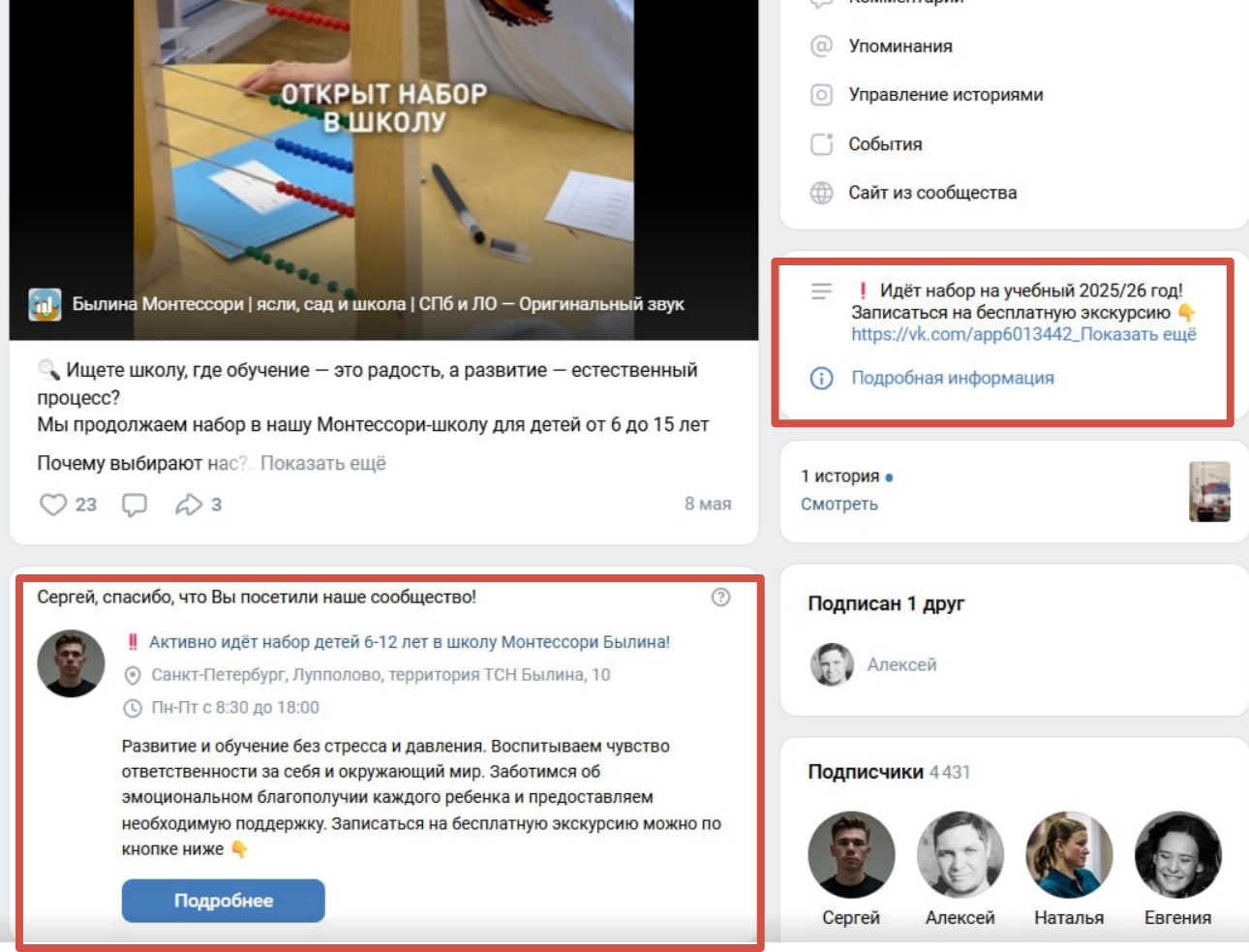 Начали работать весной 2025 года в старом кабинете ВКонтакте. В зависимости от приоритета меняли рекламируемые продукты:- сначала запускали рекламу на день открытых дверей;- затем чередовали по приоритету детский сад, ясли, начальную школу, среднюю школу.
