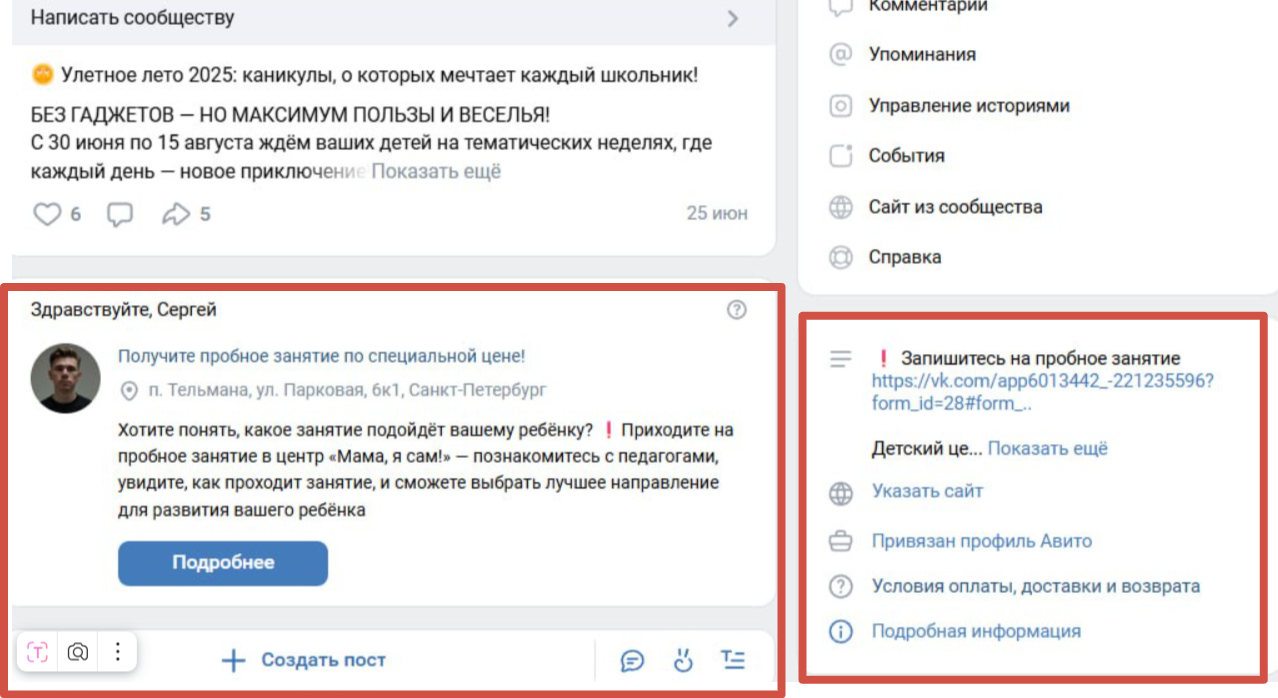 Упаковка сообщества была достаточно простой. Мы порекомендовали оформить дополнительные кнопки меню и обновить закрепленный пост. По классике добавили виджет и оффер в описании, настроили приветственное сообщение.