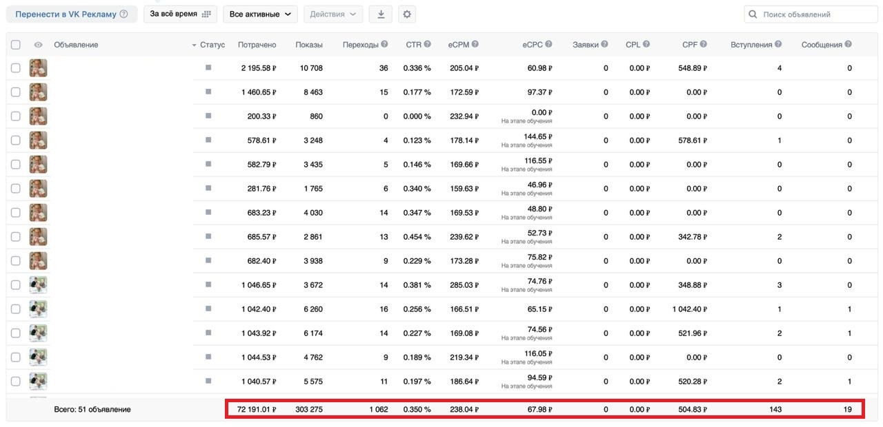 Скриншот объявлений основной рекламной кампании в старом кабинете: