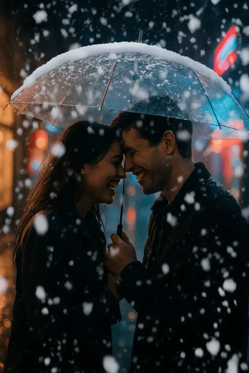 Промт: Используй людей и их лица на прикрепленных фото без изменений. Реалитическое фото. Ультрареалистичная кинематографическая уличная сцена ночью: пара под одним прозрачным зонтом, мокрый асфальт отражает неон, мокрый снег в воздухе, они смеются и наклоняются лбами друг к другу. Тёплый свет витрин + холодные неоновые блики, shallow depth of field, мягкое боке, film grain, 9:16.