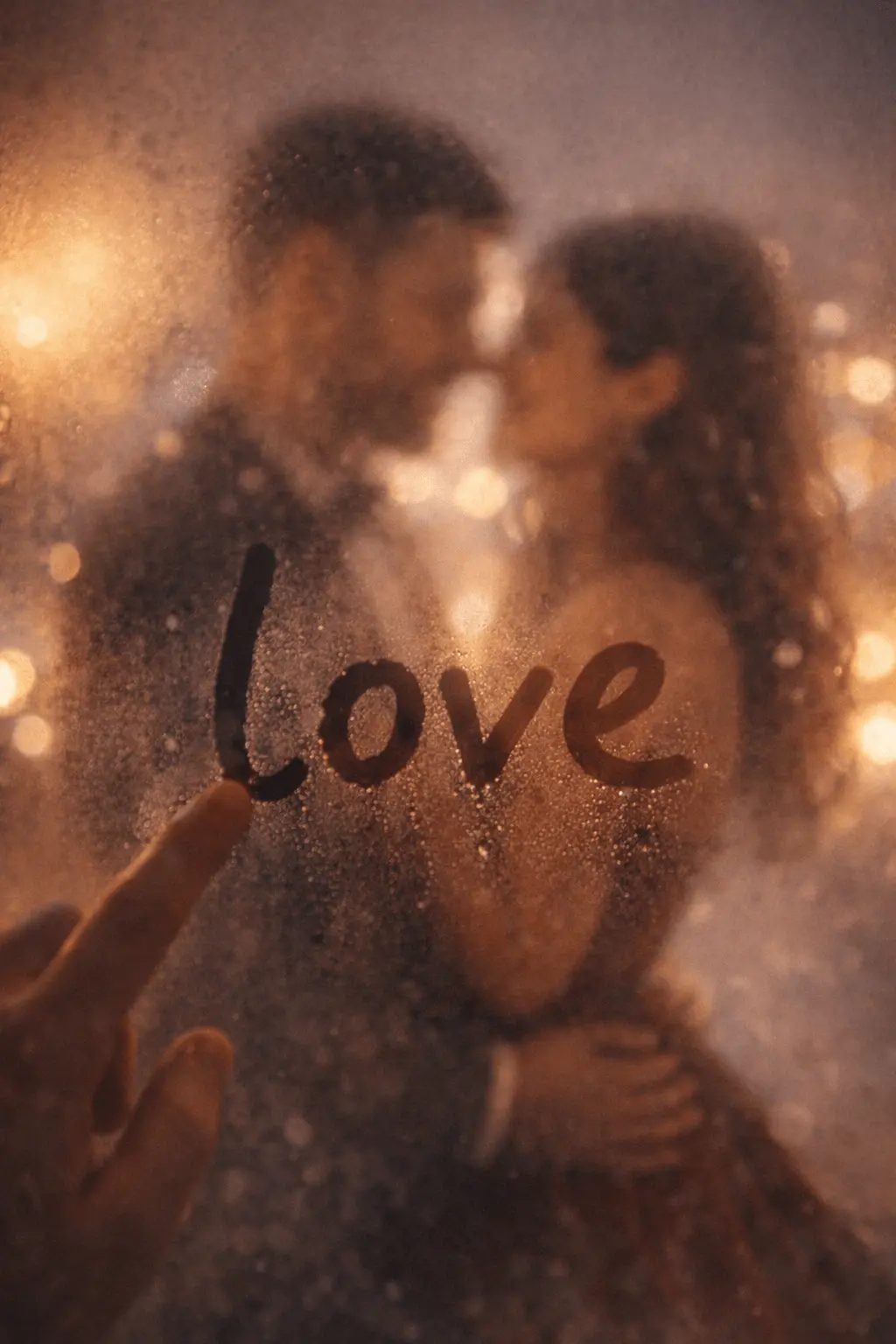 Промпт: Используй людей и их лица на прикрепленных фото без изменений. Реалитическое фото. Кинематографический крупный план: запотевшее окно, на стекле пальцем написано “love”, за стеклом пара обнимается и смотрит друг на друга, их силуэты мягко размыты, на фоне огни города. Очень мягкий свет, dreamy bokeh, high realism, 9:16.