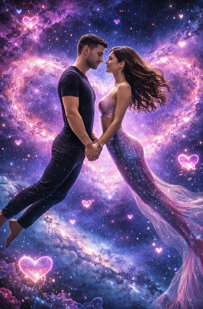 Используй людей и их лица на прикрепленных фото без изменений. Реалитическое фото. Космическая любовь: пара парит в невесомости среди звёзд и галактик, держатся за руки, вокруг розовые и фиолетовые туманности в форме сердца, cosmic Valentine's Day, dreamy sci-fi гиперреализм