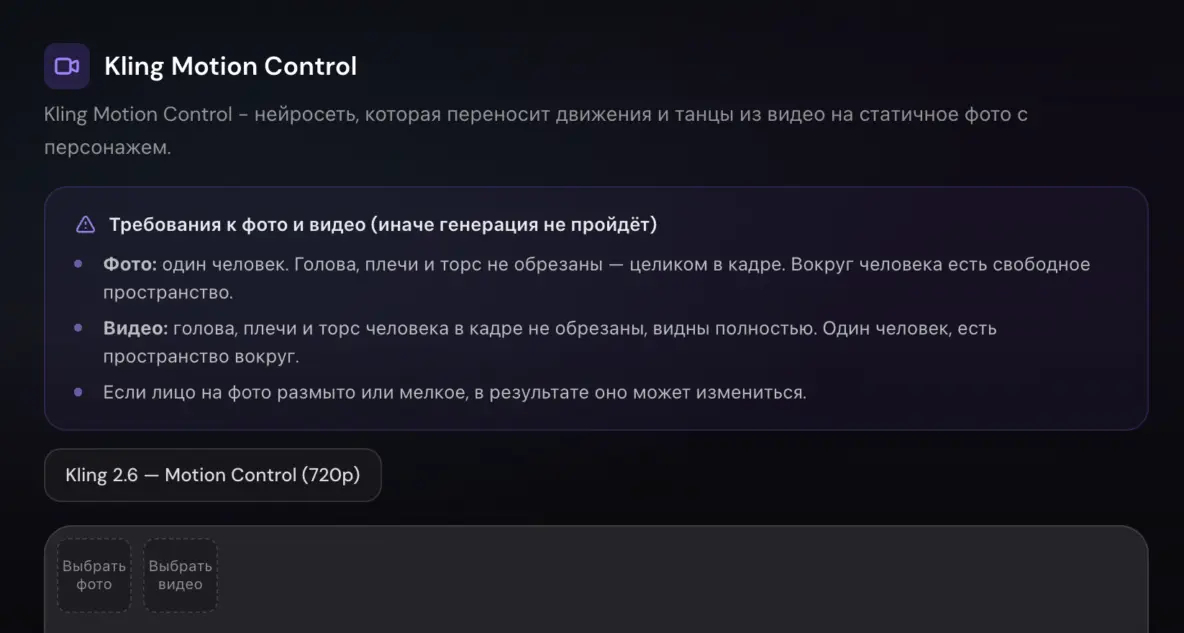 Многие инструкции в интернете предлагают использовать зарубежные нейросети для видео (например, Kling AI, Kling Motion Control) . Однако при работе с ними пользователи сталкиваются с массой проблем: жесткие лимиты на генерацию, необходимость вручную писать сложный промпт (prompt), искать качественный видео-референс и, что самое неприятное, использовать зарубежную банковскую карту для пополнения баланса.