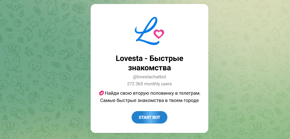 🔥 Lovesta — популярный бот знакомств в РФ с огромной базой, где умный подбор по возрасту и городу находит людей за секунды.