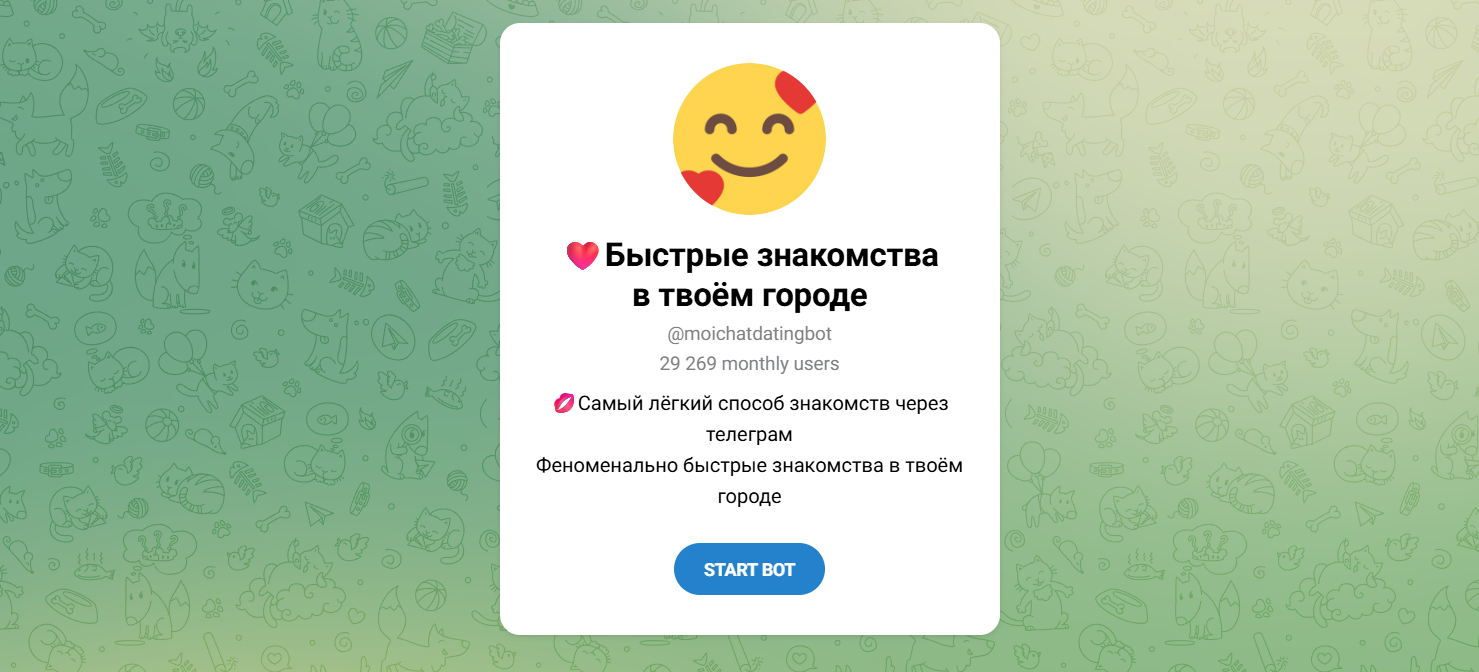Уютный сервис для локальных знакомств с аудиторией около 30 тысяч человек. Он не пытается объять необъятное, а фокусируется на качестве общения внутри конкретных городов. Если большие боты знакомства telegram кажутся тебе слишком шумными и хаотичными, MoiChat станет отдушиной. Здесь акцент сделан на легкость начала диалога и поиск "своих" людей. Часто используется как чат знакомств в тг, где можно просто поболтать, не обязательно с романтическим подтекстом.
