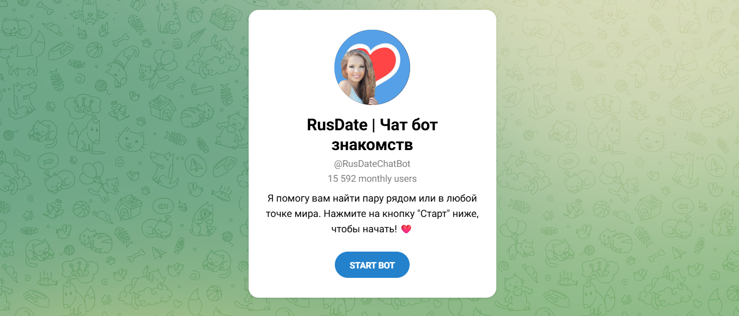 Телеграм-версия известного международного сайта знакомств. Это уже тяжелая артиллерия. Здесь сидит более серьезная аудитория, часто нацеленная на брак и создание семьи. Если тебя интересуют знакомства с замужними тг (в плане серьезности намерений людей, а не статуса) или поиск партнера для переезда — RusDate подойдет идеально. Единая база с сайтом дает возможность поиска по всему миру, что круто для релокантов. Это надежный бот знакомств для телеграма с верификацией.