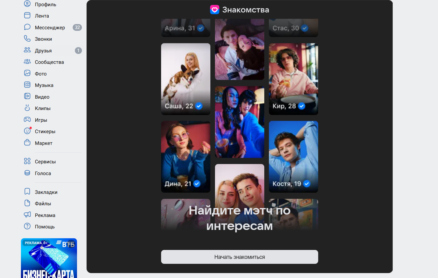 ВК Знакомства берут своей доступностью. Алгоритм, анализирующий вашу музыку и подписки в группах, выдает на удивление точные совпадения по интересам. Аудитория здесь всех возрастов, но преобладает молодежь и люди до 40 лет. Важный нюанс: обилие пользователей требует времени на перебор вариантов, так как модерация тут мягче, чем на специализированных сайтах.