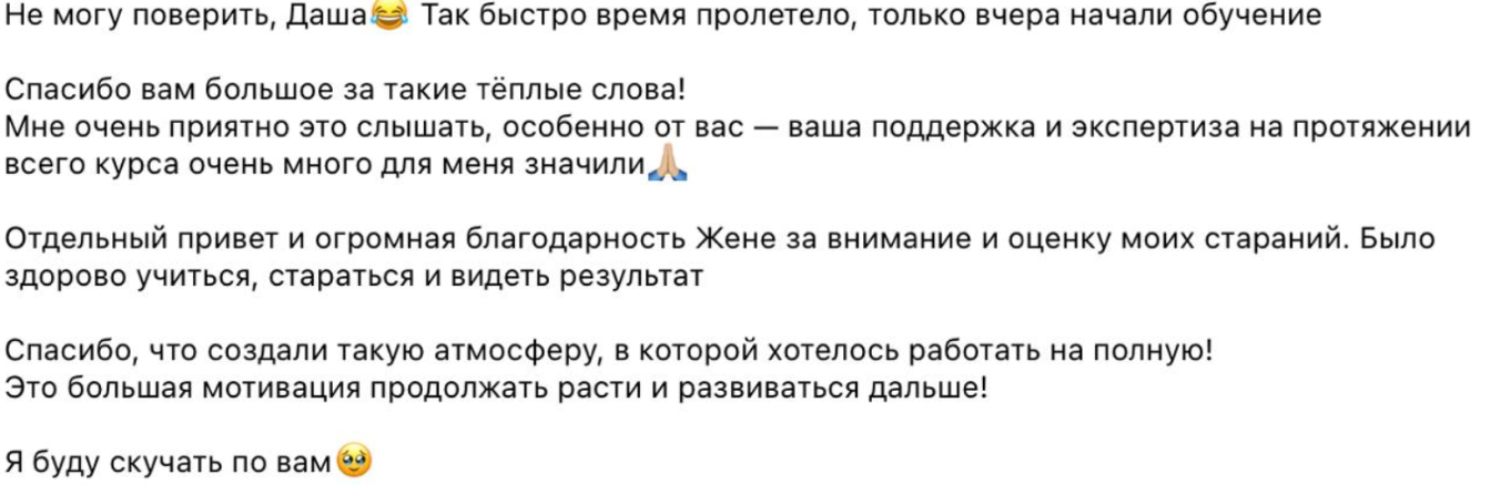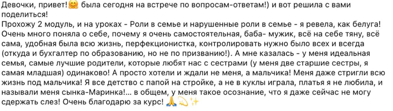 Многие спрашивают: зачем идти на такие курсы, если не собираешься работать психологом? Ответ очевиден. Чтобы прервать родовые сценарии. Чтобы перестать быть «удобной» и стать счастливой. Чтобы ваши дети не несли ваши травмы дальше. Работа и осознания здесь колоссальные.