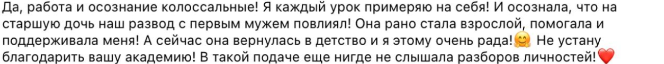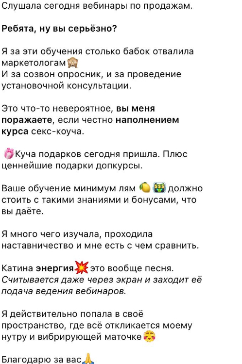 Изучая тему Академия Екатерины Бибишевой отзывы, я заметила, что самые ценные и интимные истории находятся в закрытых чатах. Мы, выпускницы, бережем это пространство. Но я считаю, что мой опыт не уникален, и чтобы показать объективную картину, важно видеть разные истории. Я хочу поделиться несколькими скринами, чтобы вы увидели, какие Екатерина Бибишева отзывы пишут женщины, прошедшие этот же путь трансформации.
