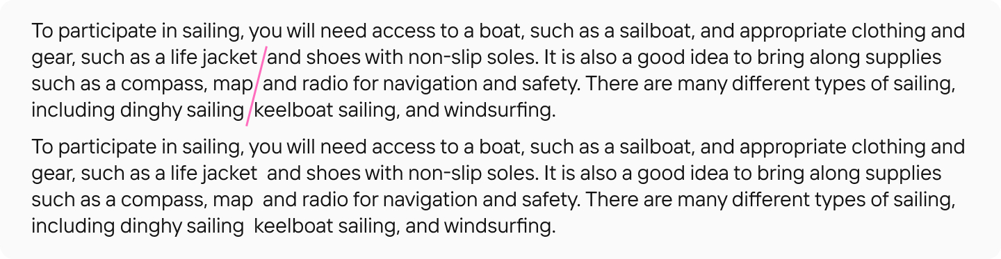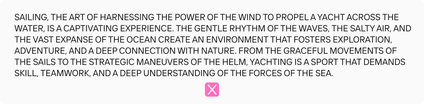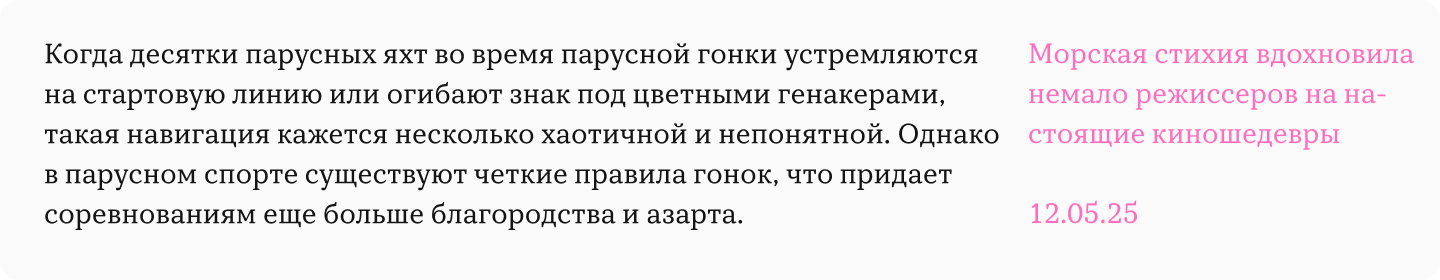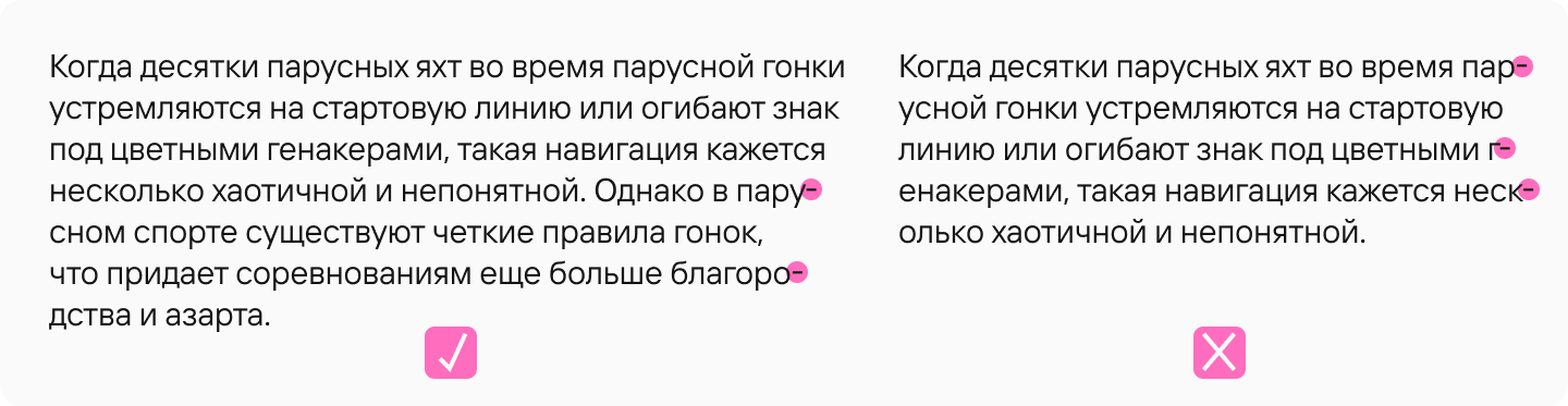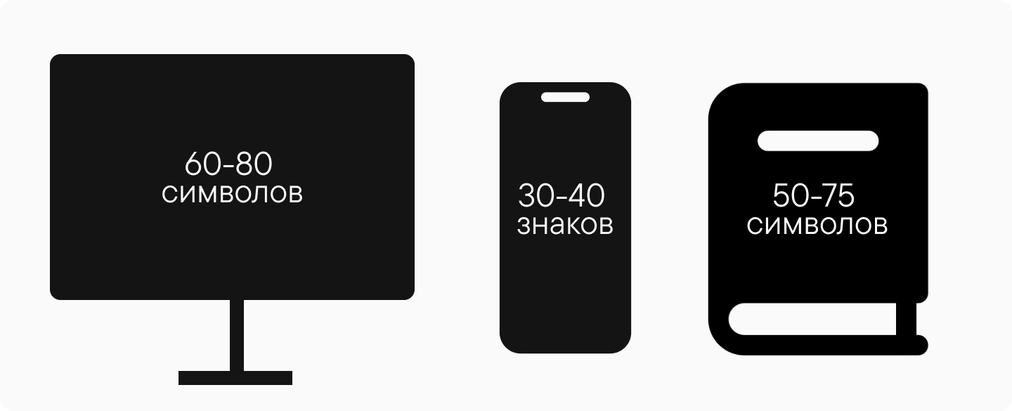 Строки должны быть достаточно короткими, чтобы было удобно переводить взгляд с одной строки на другую. Важно учитывать, что в разных средах оптимальная длина строки будет разной. Например, в печатном наборе — 50-75 символов в строке, на мониторе компьютера — 60-80 символов, на экране смартфона — 30-40 знаков.