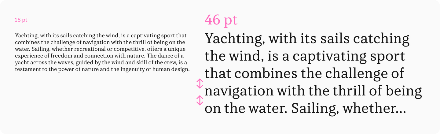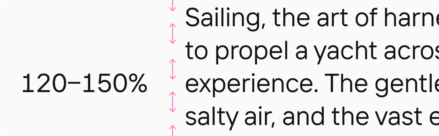 Оптимальный межстрочный интервал для текстового набора — 120–150% от кегля шрифта. Большой или слишком маленький интервал затрудняет движение взгляда по строкам.