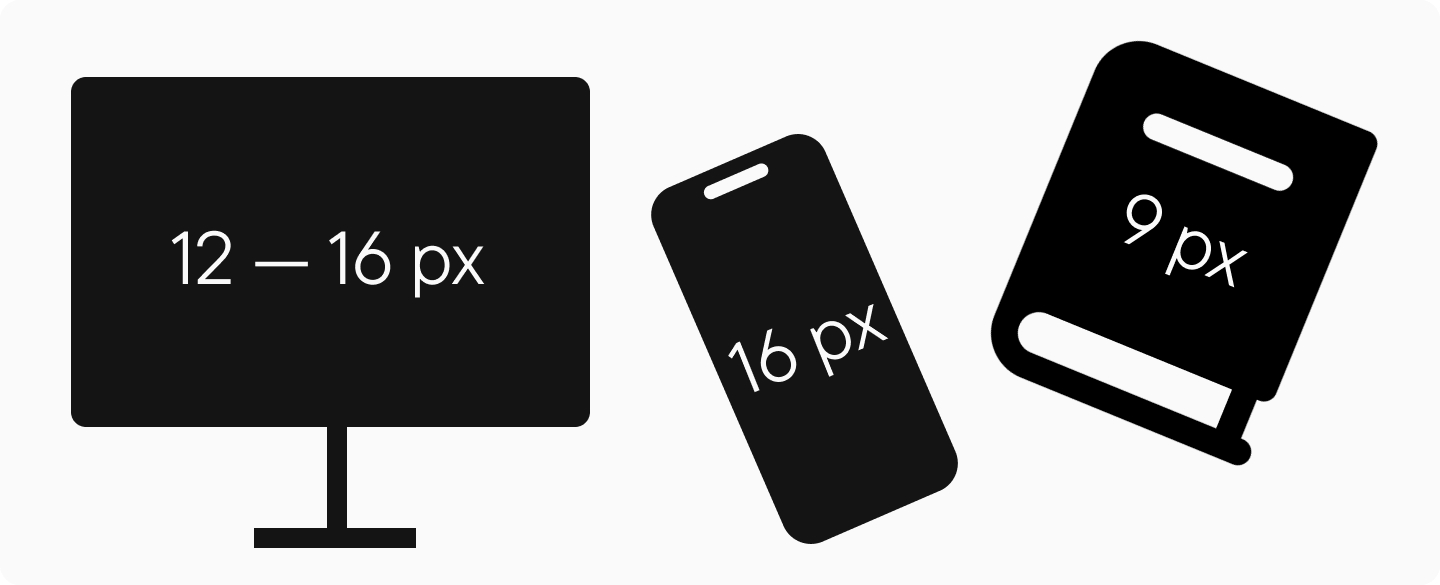 Мелкий текст быстрее утомляет глаза. Минимальный размер удобочитаемого текста на мониторе — 12 px, но для объёмных текстов рекомендуется использовать размер от 14 до 16 px; для мобильной версии сайтов и приложений — 16 px; в печати — от 9 pt для длинных текстов.