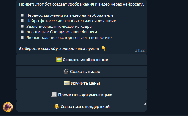 Ввожу команду /start и выбираю режим создания изображения. Интерфейс пошаговый: бот сам подсказывает, что нужно сделать дальше. Даже если раньше вы не пользовались нейросетями, разобраться здесь просто.
