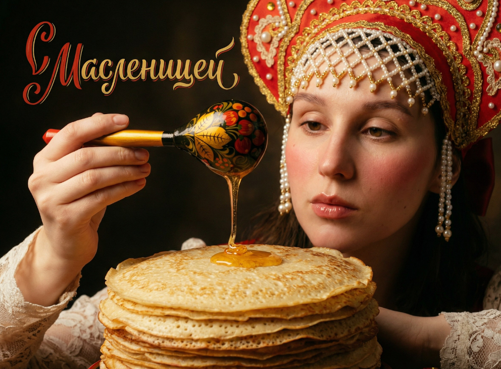 Use the face of the woman from the uploaded photo. Preserve her exact facial features, proportions, skin tone, and recognizable likeness. Do not change the face. Create an editorial close-up Maslenitsa scene. A woman wearing a richly decorated traditional Russian kokoshnik is pouring golden honey from a painted khokhloma ladle onto a tall stack of pancakes. The honey flows slowly, dripping and catching warm light as it falls. Focus on the hands, the ladle, the texture of the honey, and the pancakes. Shallow depth of field emphasizes the food details. Traditional patterns, pearls, lace sleeves, and ornamental elements are visible in the frame. Her face has soft features: rosy cheeks, glossy lips, clearly defined eyebrows. Natural beauty with realistic skin texture, visible pores, and a subtle healthy glow. The background is dark and cinematic, combining high-end food photography with fashion editorial aesthetics. Lighting is warm and neutral, with gentle directional light that enhances textures of honey, fabric, and skin. Balanced shadows and refined highlights create a theatrical, festive mood. Beautiful decorative text in clear Russian Cyrillic reading “С Масленицей” is integrated into the image. The text is written exactly as shown, correctly spelled, in Russian language only. The lettering appears as festive hand-painted calligraphy or traditional ornamental script, harmoniously placed in the composition, clearly readable and stylistically matching the Maslenitsa folk aesthetic. Ultra-detailed, cinematic, high-fashion food photography style with a subtle fine-grain film look.