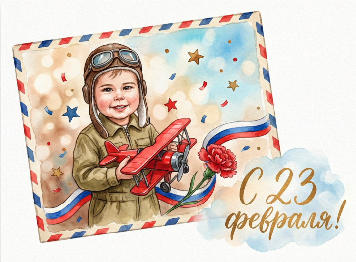 Акварельно-живописный детский постер в стиле «маленький авиатор»: улыбающийся ребёнок в кожаной лётной шапке с очками, в хаки-костюме, держит яркий красный игрушечный самолёт. Рамка конверта «авиапочта» (красно‑синие уголки), звёздочки, конфетти, ленточка триколора, красная гвоздика. Тёплый свет, мягкое боке, лёгкая фактура акварели, чистая белая подложка-открытка с тенью. Крупная каллиграфия: «С 23 ФЕВРАЛЯ!» внизу справа; Без оружия, без агрессии, максимально дружелюбно. Палитра: тёплые коричневые и кремовые, яркий красный, немного голубого.