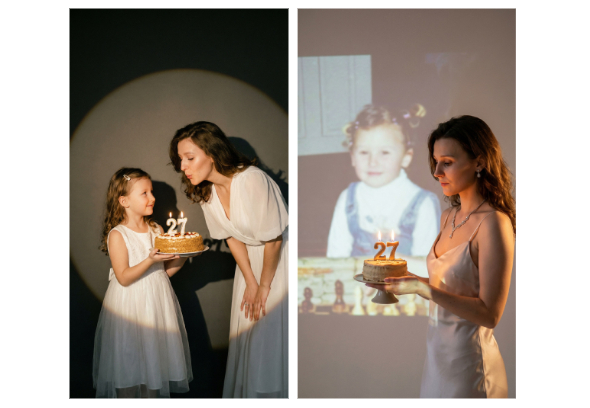 Фотореалистичный портрет в минималистичном художественном стиле. Близкий кадр, от талии до головы. На тёмно-сером чистом фоне стою я: взрослая и маленькая версия себя. Обе мы в красивых белых праздничных платьях, с естественными пропорциями, лицами, наполненными нежностью и теплом. Маленькая я держит торт и протягивает его взрослой - я собираюсь задувать горящие свечи с цифрой «27». Между героями - трогательная связь, атмосфера уюта и воспоминаний. Освещение - мягкое, тёплое, как лампа и прожектор круглой формы, световой круг отчетливо виден на темно-сером фоне. Прожектор выделяет фигуры, от них падает мягкая, глубокая тень на стену позади, словно на театральной сцене или в воспоминаниях. Эффект изображения — небольшая пленочная зернистость, слегка винтажная фактура, как у снимка из воспоминаний. Вся композиция создаёт атмосферу тишины, теплоты, ностальгии и внутренней нежности.Высокая резкость, естественные цвета и светотень. Художественно-реалистичная фотография, минимализм фона подчёркивает главных героев и их эмоции.