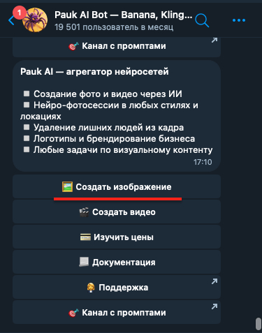 Я захожу в Telegram и запускаю Pauk AI — бот, где можно создать фото через нейросеть онлайн прямо в чате. Без регистрации и сложных настроек.