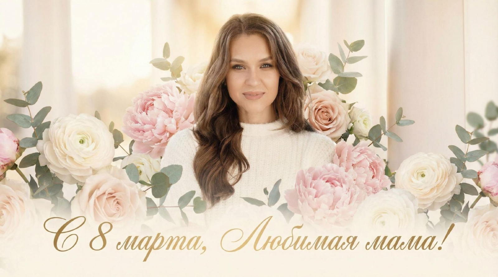 Романтичная открытка на 8 марта с использованием загруженного фото, фотореалистичный стиль, мягкий свет, нежные цветы, элегантная цветовая палитра, атмосфера любви и гармонии, сохранить черты лица без изменений Подпись на фото: С 8 марта, Любимая мама!
