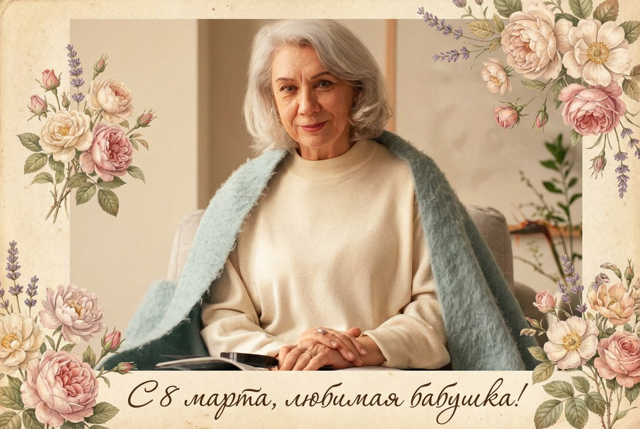 Открытка на 8 марта для бабушки с использованием загруженного фото, сохранить оригинальные черты лица, винтажный стиль, нежные цветы, тёплые оттенки, ощущение семейного уюта, аккуратная композиция, без искажений. Подпись на фото: С 8 марта, любимая бабушка!