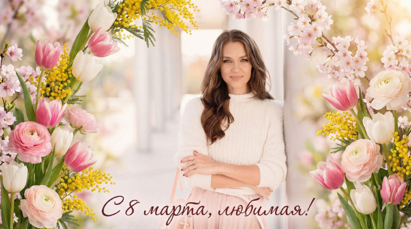 Открытка на 8 марта с использованием загруженного фото, сохранить лицо и черты без изменений, аккуратно вписать человека в праздничную композицию, весенние цветы, нежная цветовая палитра, мягкий свет, эстетика весны, высокое качество, без искажений лица. Подпись: С 8 марта, Любимая