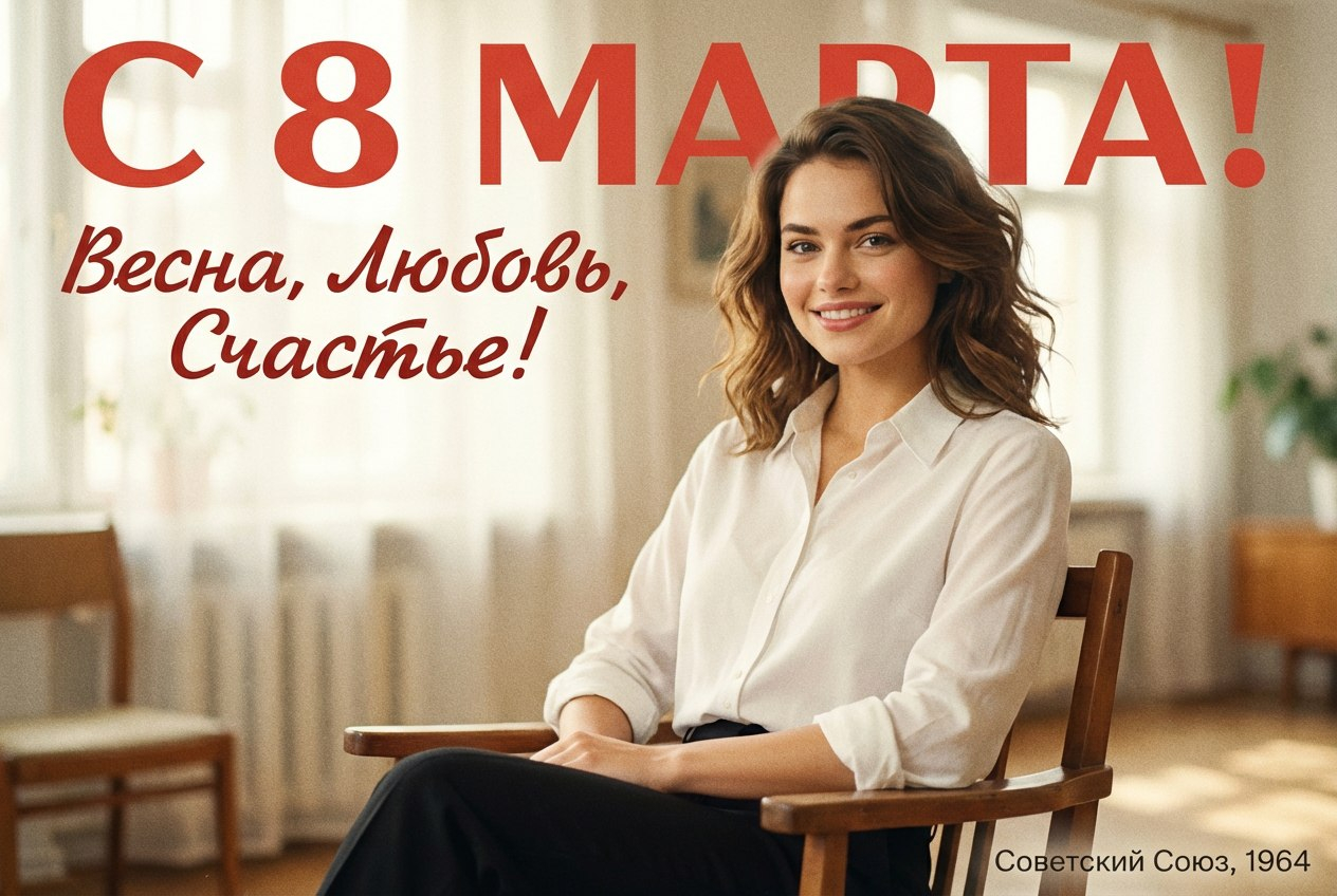 В промпте укажите: «ретро-плакат СССР», «винтажная палитра», «ограниченные цвета», «атмосфера 70-х». Так получится открытка СССР на 8 марта с ностальгической эстетикой.