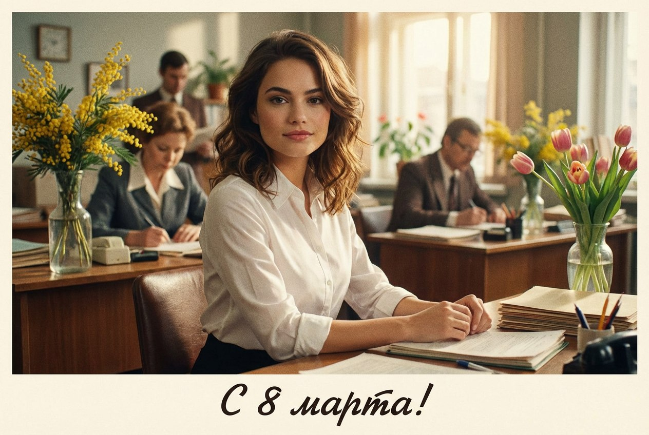 Открытка на 8 марта с загруженным фото, сохранить черты лица без изменений, стиль романтической комедии 1970-х, деловой образ, мягкий свет, лёгкий плёночный эффект, весенняя атмосфера, аккуратная композиция Открытка должна выглядеть, как кадр Советского фильма: Служебный роман. Подпись: С 8 марта!