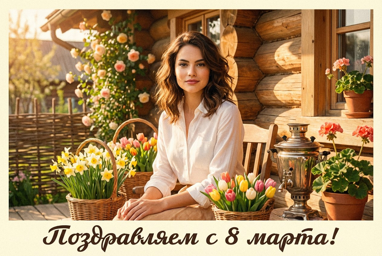Открытка на 8 марта с использованием загруженного фото, сохранить лицо без изменений, тёплая деревенская атмосфера, мягкий солнечный свет, пастельные оттенки, лёгкий винтажный эффект, весенние цветы, ощущение уюта. Легкая зернистость. Тёплые оттенки, деревенская эстетика, искренность. Открытка должна выглядеть, как кадр Советского фильма: Любовь и Голуби Подпись на открытке: Поздравляем с 8 марта!