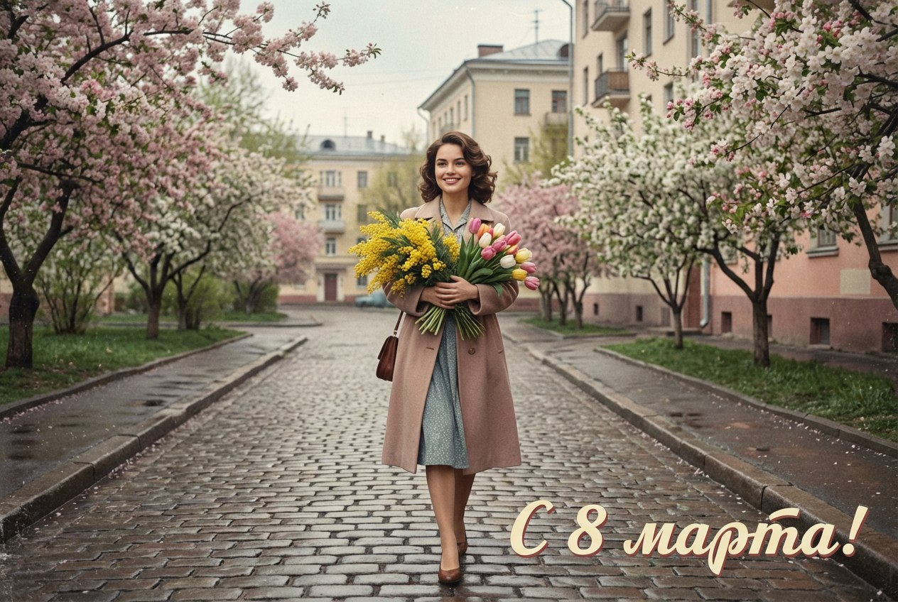 Открытка на 8 марта с загруженным фото, сохранить лицо без изменений, кинематографичный стиль конца 1950-х, мягкое освещение, нежная цветовая палитра, лёгкий плёночный эффект, романтичная атмосфера весны. Женщина идет по улице с букетом цветов. Под ногами брусчатка, Советские здания 50-х годов. Цветет яблоня. Легкая зернистость. Открытка должна выгледеть, как кадр Советского фильма Весна на Заречной улице 1956. Подпись на открытке: С 8 марта!