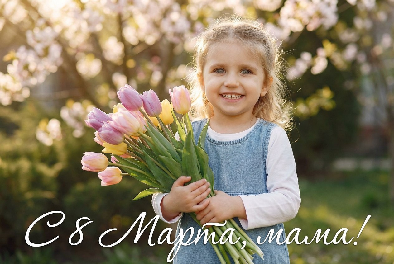 Использовать лицо и внешность ребёнка с загруженного фото без изменений. Ребёнок держит букет тюльпанов и улыбается, мягкий весенний солнечный свет, пастельные оттенки, светлый размытый фон с цветущими деревьями, реалистичная фотостилизация, праздничная атмосфера, аккуратная надпись «С 8 Марта, мама!»