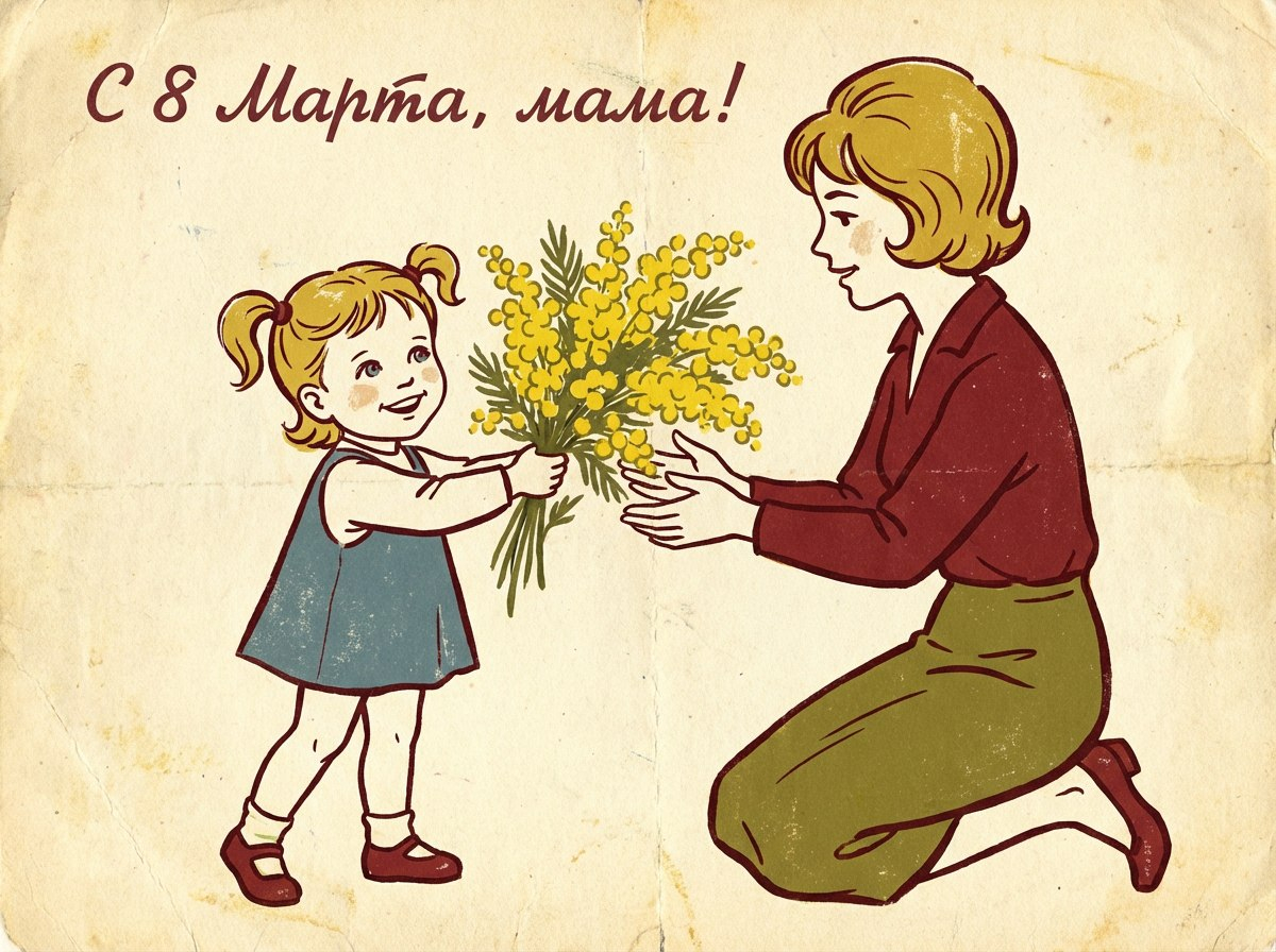 Открытка в советском стиле на 8 марта остаётся одним из самых популярных запросов. Ностальгия, минимализм и характерная графика делают такие изображения узнаваемыми и тёплыми.