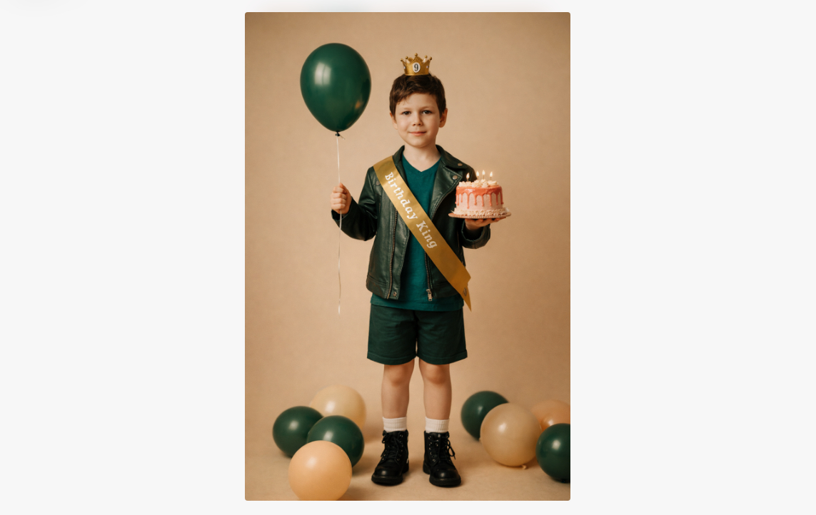 Полноростовый снимок мальчика, стоящего прямо и смотрящего в камеру на уровне глаз. Сохрани черты лица ребенка из исходного фото. В одной руке он держит тёмно-изумрудный воздушный шар на верёвке, в другой — небольшой праздничный торт с клубничной глазурью и кремом цвета розового молока. На нём — расстёгнутая куртка из тёмно-зелёной искусственной кожи, короткие шорты и футболка того же глубокого изумрудного оттенка, белые носки и чёрные высокие ботинки. Через плечо перекинута золотистая лента с надписью «Birthday King», а на голове — миниатюрная золотая корона с цифрой 9 по центру. Фон — однородная студийная стена тёплого песочного оттенка, плавно переходящая в пол без стыков и текстур. У его ног — разбросаны воздушные шары в тёплой гамме: тёмно-зелёные и бежевые, создающие уютный, сдержанный праздничный акцент. Освещение — мягкое студийное с лёгким боковым лучом, формирующим нежные тени и подчёркивающим объём торта, ткани и кожи. Общая атмосфера — спокойная, тёплая и камерная. Снято на портретный объектив 50 мм с малой глубиной резкости: мальчик и предметы в его руках в чётком фокусе, фон и пол — мягко размыты.