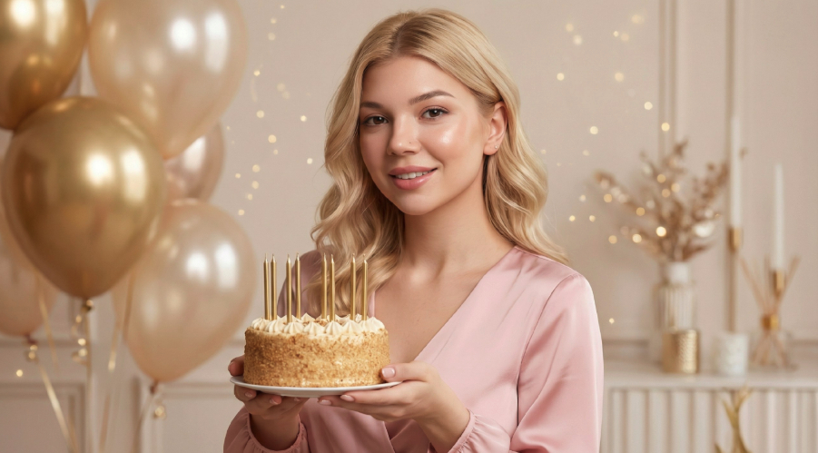 Single hyper-realistic birthday portrait (only one photo per generation) of the same person from the reference image, preserving their exact facial features, age, proportions, and unique appearance. Natural skin tone, soft diffused professional-studio lighting, clean depth of field, accurate textures, and subtle realistic highlights. No cartoonish colors. Festive variations across different generations: different celebratory outfits, refined makeup looks, various birthday-themed attributes (cake, balloons, sparkles, gifts, elegant accessories, party decorations). Decorations may use soft gold, champagne, or pastel tones to maintain a refined and photoreal aesthetic. The location, outfit, and props change with each generation, but the person’s identity, facial consistency, and realistic style remain the same. Warm, bright, natural color palette true to real-life photography