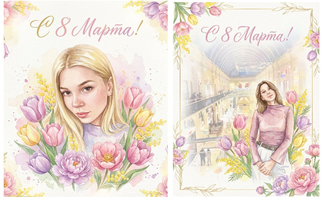 Создай нежную праздничную открытку к 8 марта на основе загруженной фотографии. Сохрани лицо и черты человека без искажений. Добавь атмосферу весны: мягкое тёплое освещение, цветущие тюльпаны, мимозу и нежные розовые и сиреневые оттенки. Добавь элегантные цветочные рамки по краям, лёгкое свечение и эффект воздушности. В верхней части размести красивую каллиграфическую надпись «С 8 Марта!» золотым или пастельно-розовым шрифтом. Стиль — изысканный, женственный, светлый, праздничный, высокое качество, детализированная обработка, мягкий фокус, cinematic light. Создай открытку к 8 марта в акварельном стиле на основе фотографии. Сохрани естественность лица. Добавь нарисованные акварельные цветы (пионы, тюльпаны), мягкие пастельные мазки, светлый фон, лёгкую текстуру бумаги. Надпись «С 8 Марта!» изящным рукописным шрифтом.